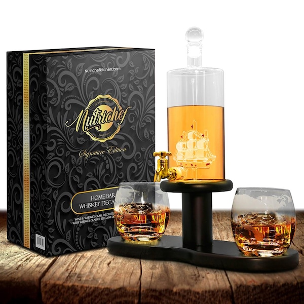 Features: - Wine & Spirit Decanter Set - Classic Clear Glass Decanter Style - Naturally Aerates for Full Flavor & Aroma - Oxidation Preserves & Enhances Drink Taste - Separates Sediment Effectively Before Pouring - Elegant Home Bar & Tabletop Accent Decoration - Attractive & Stylish Smooth Barrel Clear Glass Design - Beautifully Detailed Antique Ship Adds a Unique Feel - Glass Globe Decanter Conveniently Detaches from Base Stand - World Map Etched-Texture Whiskey Glass Design - Integrated Pouring Spigot Dispenser - Environmentally Friendly Construction - Lab Tested, BPA Free, Food Grade Safe - Stain-Resistant & Easy-to-Clean - Includes Whiskey Glasses and Decanter Stopper - Used for Scotch, Brandy, Bourbon, Rum, Gin, Liqueur, Wine, Whisky, Vodka What’s in the Box: - Glass Decanter - Decanter Stopper - (2) Whiskey Glasses - Base Stand Technical Specs: - Decanter Capacity: 780ml / 26 oz - Whiskey Glass Capacity: 300ml / 10 oz - Construction Materials: Engineered Wood, Reinforced Silica Glass - Whiskey Glass Size (L x W x H): 3.4’’ x 3.4’’ x 3.4’’ -inches - Glass Decanter Size (L x W x H): 3.3’’ x 5.7’’ x 7.6’’ – inches - Total Assembled Size (L x W x H): 11.81’’ x 6.3’’ x 13.23’’ -inches (Base & Decanter)