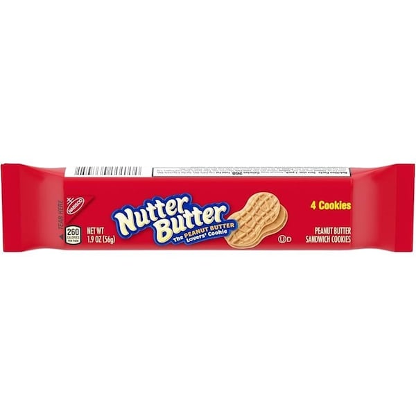 Nutter Butter Lunchbox Cookies, Pack Container, 1.9 oz Net Content, Artificial Flavor, Nutritional Information: 260 Calories, 14% 11 g Total Fat, 13% 2.5 g Sat Fat, 0 g Trans Fat, 0% 0 mg Cholest, 9% 200 mg Sodium, 14% 39 g Total Carb, 4% 1 g Fiber, 16 g Total Sugars (32% Incl 16 g Added Sugars), 0% 4 g Protein, 0% Vit D, 0% Calcium, 8% Iron, 0% Potassium, Ingredients: Unbleached Enriched Flour (Wheat Flour, Niacin, Reduced Iron, Thiamine Mononitrate (Vitamin B1), Riboflavin (Vitamin B2), Folic Acid), Sugar, Peanut Butter (Roasted Peanuts, Corn Syrup Solids, Hydrogenated Vegetable Oil (Rapeseed, Cottonseed, and Soybean Oils), Salt, Peanut Oil), Canola Oil, Whole Grain Wheat Flour, High Fructose Corn Syrup, Palm Oil, Salt, Leavening (Baking Soda, Calcium Phosphate), Soy Lecithin, Artificial Flavor, Contains Wheat, Peanut, Soy, Includes: (4) Lunchbox Cookies