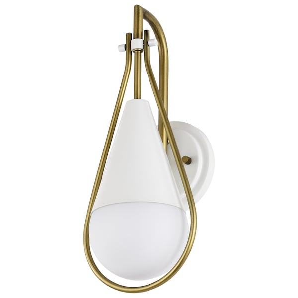 A modern collection with a twist, the Admiral 60-7921 one-light wall sconce features a dual finish, unique design, and a fashionable statement for home luminaires. A suspended tear-dropped shape is comprised of matte white with natural brass elements encompassing the fixture. The white opal glass orb shields the-light source for smooth, even-lighting to bring a warm glow to any space. A beautiful design that is versatile and will compliment a variety of home decors.