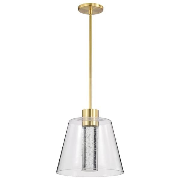 A fusion of contemporary style and classic allure, the exquisite Aura 62-2182 LED medium pendant is elegantly crafted for today's style. A dance of light awaits with integrated LED shining through a K9 bubble crystal column, inviting you to enjoy its warmth and glow through the clear glass shade. Featuring the latest in LED technology, the fixture comes in 3000K soft white light. The rich brushed brass effortlessly compliments the clear glass shade, working well with existing finishes, and decor. Picture your space transformed with beautiful simplicity, the latest technology, and design that is a celebration of here and now with Aura.