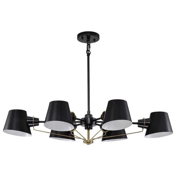 The Baxter 60-7386 six-light chandelier does not disappoint with its modern design and impressionable style. The black shades are finely cut at an angle and feature a white interior to maximize the light output. The lustrous burnished brass stems attach from the lamps to the center of the fixture, beautifully mimicking the angles of the shades. This excellent fixture will bring years of beautiful and timeless lighting to your home.