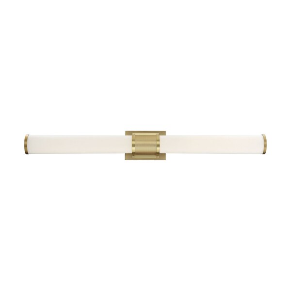 The Caper 62-1603 LED vanity light is designed in a contemporary style perfect for lighting your bath. It features a tube shape comprised of a frosted lens. The broad, perforated band in the center complements the end caps and are all finished in a beautiful antique brushed brass.