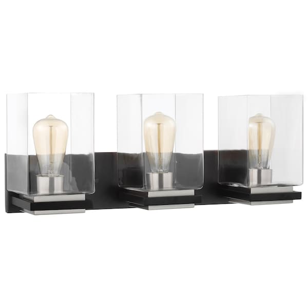 A combination of glass and metal comes together to create the stunning design of the Crossroad 60-7653 vanity light. The square, clear glass showcase the bulbs. The sockets and base are finished in brushed nickel to contrast beautifully with the matte black finish. Bring stylish, contemporary flair to your bath or powder room, or spruce up a tired entryway. The applications are boundless.