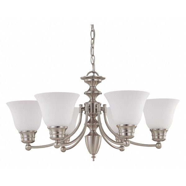 The Ballerina 60-3255 6 light, 26 inch chandelier features a brushed nickel finish, accented with frosted white glass. Illuminate living rooms, dining rooms, or any room in the home that could use some extra lighting with this six light chandelier. Stylish and elegant, impress your guests with this sophisticated chandelier.