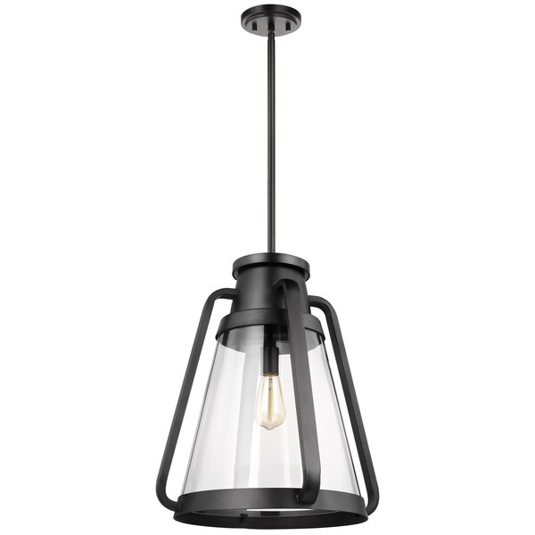 Glass and overlaying metal create a nice depth with the Everett 60-7554 large pendant. The clear, tapered glass provides 360-degree illuminations. When paired with a vintage bulb, it creates a maritime-vintage style. A matte black finish on the fixture body, rods, and swivel canopy results in a style suited to many kitchen decors or applications of your choosing.