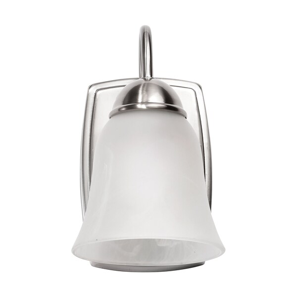 The Nuvo 1-light LED vanity fixture mounts flush against a wall. The bell-shaped, alabaster glass shade helps to soften the light. The integrated LED module is equivalent to a 60-watt incandescent bulb. The LED module will last for 45 years, at a rate of three hours per day.
