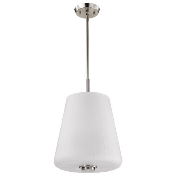 - Finished in Brushed Nickel with Etched White Glass