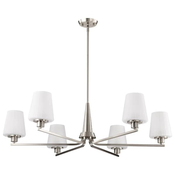 Lune, 6 Light Chandelier, Brushed Nickel Finish, Etched White Glass