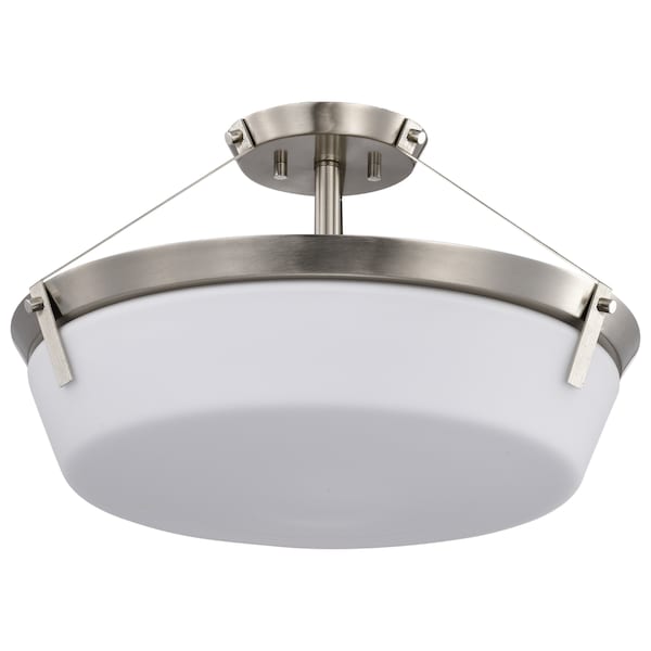 The Rowen 60-7762 semi-flush mount is a versatile-lighting fixture that exudes elegance and sophistication. The brushed nickel finish gives the fixture a chic and inviting look, while the etched white glass diffuses the-light to create a soft and ambient glow. Providing ample illumination makes the Rowen flush mount perfect for larger spaces or areas that require bright-lighting.