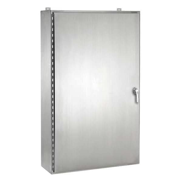 Enclosure NEMA Rating 12, 3R, 4, 4X, Material of Enclosure 304 Stainless Steel, 30 in, Hinged Enclosure Cover Type, Solid / Clear Cover Solid, Closure Method Handle, Finish Brushed, Color Silver, Depth 12 in, Enclosure Cover Features Hasp and Staple for Padlocking, Features Data Pocket, Polyurethane Gasket, Height 36 in, Interior Panel 32FT57, IP Rating IP66, Metal Gauge 14 ga, Wall Mounting, Series A4SW3, Standards cUL Listed Per CSA C22.2 No 94, File No E61997, IEC 60529, UL 508A Listed