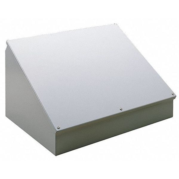 Sloped Top Consolet, 12,13 NEMA Rating, 65 IP Rating, Material Carbon Steel, Metal Gauge 14, Hinged Cover Type, Height 8 In., Width 8 In., Depth 7.09 In., Color Gray, Finish ANSI 61 Polyester Powder, Latch Type Screws, Gasket Neoprene, Series C5, Mounting Pedestal/Table, Includes Bonding Provision, No Knockouts, Standards NEMA/UL,CSA,IEC,cUL