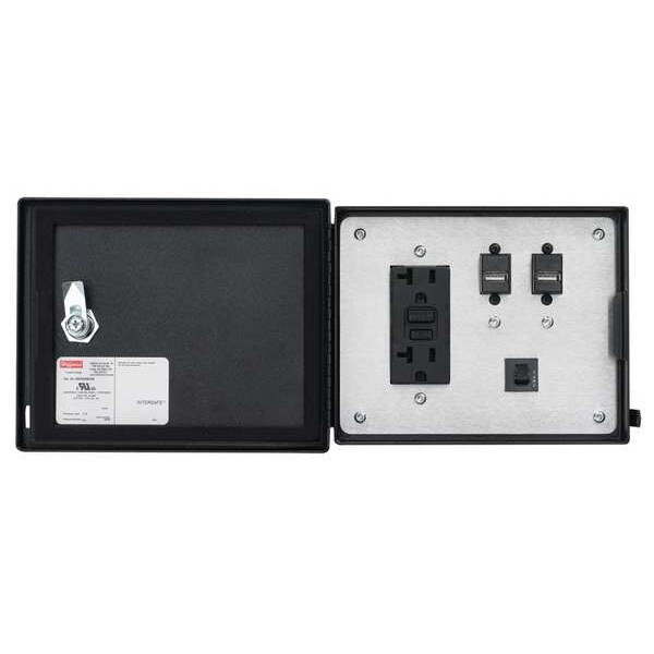 Data Interface Port, Front Cover Material Mild Steel, Circuit Breaker Reset 5 A Reset, IP Rating IP66, NEMA Rating NEMA 12, NEMA 4, Overall Height 8 1/2 in, Overall Width 8 in, Panel Configuration (2) USB Type A, 120V GFCI Receptacle, Panel Terminations (2) USB Type A, Voltage Rating 120 V AC, For Panel Cutout Height 6 in, For Panel Cutout Width 4 7/8 in, Application Data, Power, Includes GFCI Yes, Mounting Hole Dia. 9/64 in, Number of Mounting Holes 4