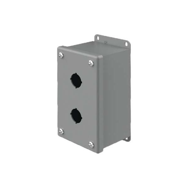 Push Button Enclosure, Number of Columns 1, Number of Holes 2, NEMA Rating 12, Conduit Size No Conduit Entrance Holes Provided, Dimensions 5.75 in H x 3.25 in W x 2.75 in D, Hole Size 22 mm, Material Steel, Height 5.75 in, Width 3.25 in, Depth 2.75 in, Color Gray, Includes Captive Cover Screws, Grounding Stud, Oil Resistant Gasket, For Use With All Standard Brands of 22mm Oil Tight Push Buttons, Switches and Pilot Lights, Mounting Style External Feet
