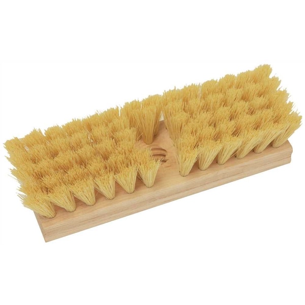 10 in. deck scrub brush with tampico fibers which provide durability and high resistance to solvents and heat. Natural hardwood block, 2-inch trim. Use with threaded handle.Tampico fibers provide durability and high resistance to solvents and heatSanitary Foam Block will not crack, warp, or splinterUse with threaded handle2 in. trim