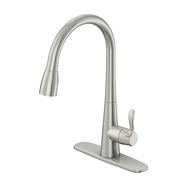 The Oak Brook Single-Handle Pull-Down Sprayer Kitchen Faucet in Brushed Nickel highlights a simple design. The spray head has two modes full and aerated to help with all kinds of cleaning.