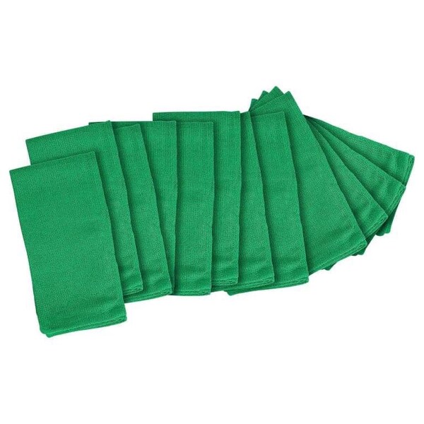 These towels are made of 100% cotton. They measure 16in x 26in and are new, never been used. Green color. 100 per case.