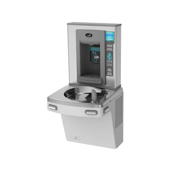 Drinking Fountain with Bottle Filler, Station Type Bottle Filling Dispenser, Single Fountain, Fountain Actuation Front Push Button/Side Push Button, Bottle Dispenser Actuation Sensor, Includes Water Filter Water Filter Not Included, ADA Compliant ADA Compliant, Cooling Capacity 8 gph @ 50 Degrees F, Housing Color Gray, Housing Finish Powder Coated, Overall Height 37 13/16 in, Overall Depth 18 5/8 in, Overall Width 17 5/8 in, Mounting Location Wall Mount