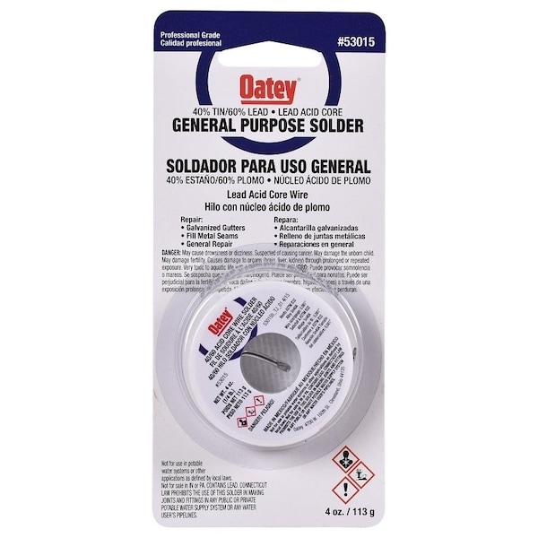 Oatey acid core wire solder is a tin-lead alloy wire solder with a rosin flux core designed for general use, such as repairing galvanized gutters and filling metal seams.