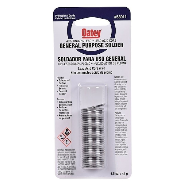 Oatey acid core wire solder is a tin-lead alloy wire solder with a rosin flux core designed for general use, such as repairing galvanized gutters and filling metal seams.