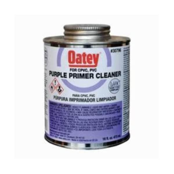 Oatey pipe Primer/Cleaner all purpose, 16 oz, 1.05 lb net weight, translucent liquid, purple, solvent, 180 g/L VOC, -4°F flash, composition: acetone, cyclohexanone, 0.79 specific gravity.