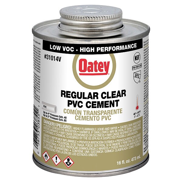 Cement, For Material Type PVC, Series Regular, Container Size 16 fl oz, Container Type Brush-Top Can, For Maximum Pipe Diameter 4 in, Working Time 15 min, Minimum Operating Temperature 40 Degrees F, Maximum Operating Temperature 110 Degrees F, Color Clear, Standards ASTM D2564, NSF/ANSI 61, SCAQMD 1168/316A, UL Greenguard Gold, For Application Type For Drain, Waste, and Vent Pipe, Electrical, Potable Water, Full Cure Time 2 hr, Maximum Viscosity 500 cps, Minimum Viscosity 80 cps