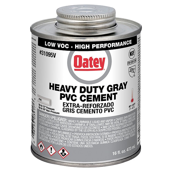 Cement, For Material Type PVC, Series Heavy Duty, Container Size 16 fl oz, Container Type Brush-Top Can, For Maximum Pipe Diameter 12 in, Working Time 15 min, Minimum Operating Temperature 40 Degrees F, Maximum Operating Temperature 110 Degrees F, Color Gray, Standards ASTM D2564, NSF/ANSI 61, SCAQMD 1168/316A, UL Greenguard Gold, For Application Type For Drain, Waste, and Vent Pipe, Electrical, Potable Water, Full Cure Time 2 hr, Maximum Viscosity 2,500 cps, Minimum Viscosity 1,200 cps