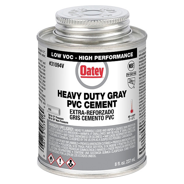 Cement, For Material Type PVC, Series Heavy Duty, Container Size 8 fl oz, Container Type Brush-Top Can, For Maximum Pipe Diameter 12 in, Working Time 15 min, Minimum Operating Temperature 40 Degrees F, Maximum Operating Temperature 110 Degrees F, Color Gray, Standards ASTM D2564, NSF/ANSI 61, SCAQMD 1168/316A, UL Greenguard Gold, For Application Type For Drain, Waste, and Vent Pipe, Electrical, Potable Water, Full Cure Time 2 hr, Maximum Viscosity 2,500 cps, Minimum Viscosity 1,200 cps