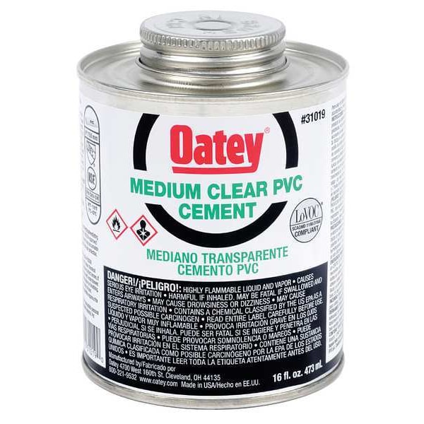 Pipe Cement, For Material Type PVC, Series Medium, Container Size 16 fl oz, Container Type Brush-Top Can, For Maximum Pipe Diameter 6 in, Working Time 2 min, Minimum Operating Temperature 40 Degrees F, Maximum Operating Temperature 110 Degrees F, Color Clear, Standards ASTM D2564, BAAQMD Method 40, For Application Type For Drain, Waste, and Vent Pipe, Potable Water, Full Cure Time 6 min, Maximum Viscosity 500 cps, Minimum Viscosity 0 cps