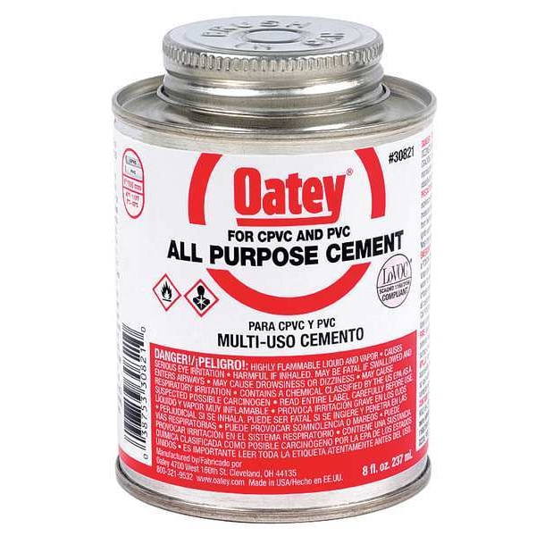 Pipe Cement, For Material Type ABS, CPVC, PVC, Series All Purpose, Container Size 8 fl oz, Container Type Brush-Top Can, For Maximum Pipe Diameter 6 in, Working Time 2 min, Minimum Operating Temperature 40 Degrees F, Maximum Operating Temperature 110 Degrees F, Color White, Standards ASTM D2235, ASTM D2564, ASTM F493, BAAQMD Method 40, For Application Type For Drain, Waste, and Vent Pipe, Potable Water, Full Cure Time 6 min, Maximum Viscosity 500 cps, Minimum Viscosity 0 cps