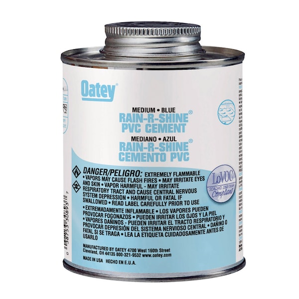 Oatey® Rain-R-Shine® Medium Blue PVC Cement is formulated for wet conditions or situations involving fast installation or pressurization of PVC pipe and fittings up to 6 diameter with interference fit.