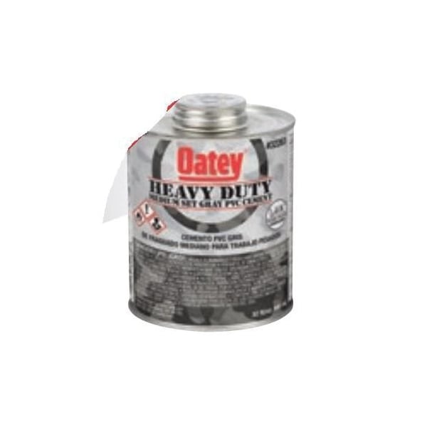 pOatey PVC Cement, 16 oz, 27 lb Net Weight, Liquid, Gray, 510 gL VOC, 4 to 5 min Setting Time, DomesticppOatey Heavy Duty Medium Set Gray PVC Cement is designed to have a thicker viscosity and medium set time for use with large diameter pipe and in commercial applicationsp