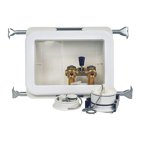 Fire-rated washing machine outlet box2 in. drain opening fits PVC or ABS Sch. 40 DWV pipeConnects to PEX supply line with F1960 cold expansion connectionWarnock Hersey certified for 1-hour and 2-hour fire-rated wallsBox made of Bulk Molding Compound (BMC) with UL-classified intumescent pads and UL-classified insulating materialAdjustable metal mounting brackets, easy to remove test capFlexible valve/drain arrangement capabilitiesIncludes single 1/4-turn valveBox Dimensions: 8-1/3 in. W x 5-1/2 in. H x 3-3/4 in. DFaceplate Dimensions: 10-1/5 in. W x 7-2/5 in. HIncludes 2 Oatey Quiet Pipe hammer arrestors to reduce noise and protect pipes