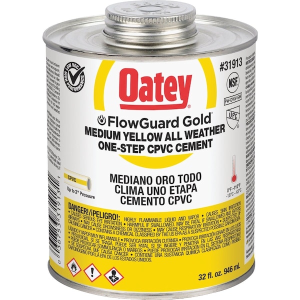 Oatey FlowGuard Gold 1-Step All Weather Fast Set Yellow Cement is recommended for cold water systems and hot water systems up to 200 Deg F/93 Deg C.Its prevention formula is designed to help protect pipes from corrosion. Its medium body has excellent gap filling properties and is easy to apply with included in-lid dauber.This yellow low VOC fast set cement can be used to solvent weld copper tube sizes (CTS) CPVC hot and cold potable water pipes and fittings up to 2 in. diameter with interference fit. Low VOC high performance solvent cement that meets California South Coast Air Quality Management Districts (SCAQMD) 1168/316A or BAAQMD Method 40 requirements meets ASTM Standard F493 and complies with NSF/ANSI 61 health effects requirements.