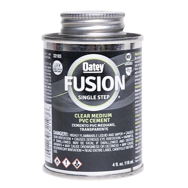 Oatey FUSION Single-Step Clear Self-Priming Medium Bodied PVC Cement is recommended for residential and DIY plumbing projects. Saving time, money and cleanup, it eliminates the extra step of priming in PVC projects, while also applying easily with included in-lid dauber and providing a neat, transparent finish. This clear, low odor, medium bodied cement can be used to solvent weld all schedules and classes of PVC pipe and fittings up to 4 in. and non-pressure applications up to 6 in. with interference fit. Oatey products have earned the trust of plumbing professionals for over 100 years.