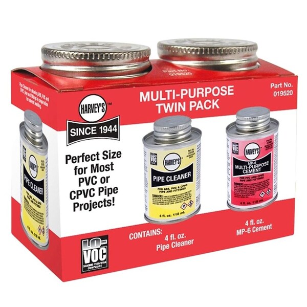 Cleaner and multi-purpose PVC/CPVC convenient project pack contain one 4oz. all-purpose pipe cleaner and one 4oz. multi-purpose solvent cement. For most ABS PVC or CPVC projects. Twin pack.