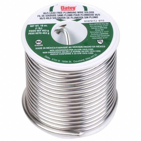 Solder Wire, Form Solid Wire, Material Composition 95 Percent Tin, 5 Percent Antimony, Wire Diameter 0.117 in, Weight 1.05 lb, Melting Temperature (Minimum) 450 Degrees F, Melting Temperature (Maximum) 464 Degrees F, Solder Series 95/5, Application Plumbing, Color Gray, Container Type Spool, Flux Requirement Flux Required, Gauge 19 ga, Standards NSF Listed