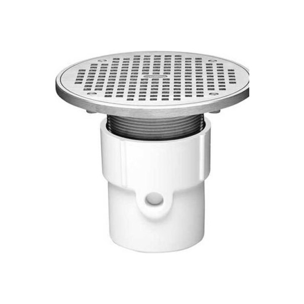 Oatey 72388 4" pvc adjustable general purpose pipe fit drain with 10" cast chrome grate & round top oatey adjustable general purpose floor drains are used for general service in restaurants, restrooms and other commercial applications where traffic is expected. Barrel assembly is completely adjustable to meet the finished floor height.