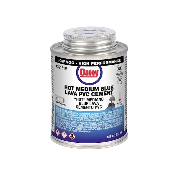 Oatey blue lava medium bodied fast set hot cement is recommended for DWV repair, irrigation and pool and spa applications. It is formulated for wet conditions, quick pressurization and fast installation and is easy to apply with included in-lid dauber. This blue, medium body, very fast setting PVC cement can be used to solvent weld all schedules and classes of PVC pipe and fittings up to 6 in. diameter with interference fit. Oatey products have earned the trust of plumbing professionals for over 100 years.