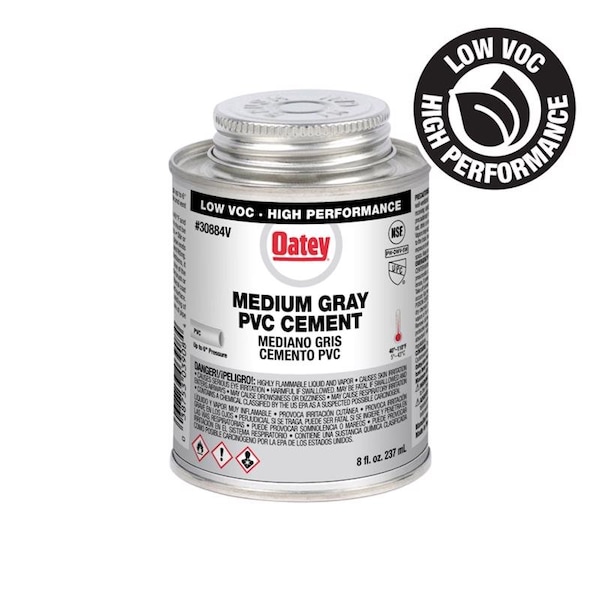 Oatey PVC Medium Gray Fast Set Cement is recommended for DWV, pressure pipe, potable water, and electrical applications. Its medium body has excellent gap-filling properties and is easy to apply with an included in-lid dauber. This gray, fast-set cement can be used to solvent weld all schedules and classes of PVC pipe and fittings up to 6 in. diameter with an interference fit. Oatey products have earned the trust of plumbing professionals for over 100 years.