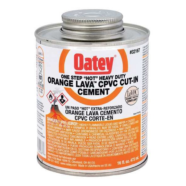 Pipe Cement, For Material Type CPVC, Series Lava Cut-In, Container Size 16 fl oz, Container Type Brush-Top Can, For Maximum Pipe Diameter 6 in, Working Time 2 min, Minimum Operating Temperature 90 Degrees F, Maximum Operating Temperature 200 Degrees F, Color Orange, Standards ASTM D2846, ASTM F493, BAAQMD Method 40, SCAQMD 1168/316A, Full Cure Time 5 min, Maximum Viscosity 1,600 cps