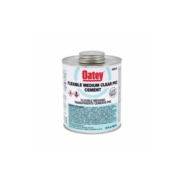 pOatey PVC Cement, Low VOC, 32 oz, Translucent Liquid, Clear, Solvent, 510 gL VOC, 14 to 23 deg F Flash, Composition Furan, Tetrahydro, Acetone, Polyvinyl Chloride, Cyclohexanone, Bis 2Ethylhexyl Terephthalate, Silica, Amorphous, Fumed, DomesticppOatey PVC Flexible Medium Clear Cement is formulated for use on flexible PVC pipe and rigid fittings up to 6 in diameter with interference fitp
