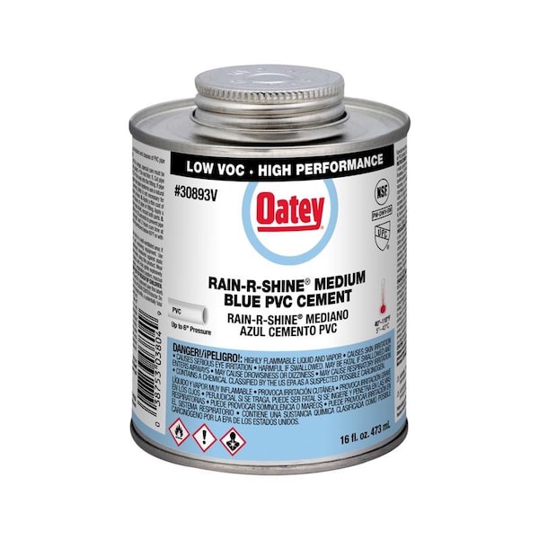 Oatey PVC Rain-R-Shine Medium Bodied Fast Set Blue Cement is recommended for pool and spa, irrigation, potable water, pressure pipe and DWV applications. It is formulated for wet conditions and quick pressurization, and is easy to apply with included in-lid dauber. This blue, medium bodied, fast set cement can be used to solvent weld all schedules and classes of PVC pipe and fittings up to 6 in. diameter with interference fit. Oatey products have earned the trust of plumbing professionals for over 100 years