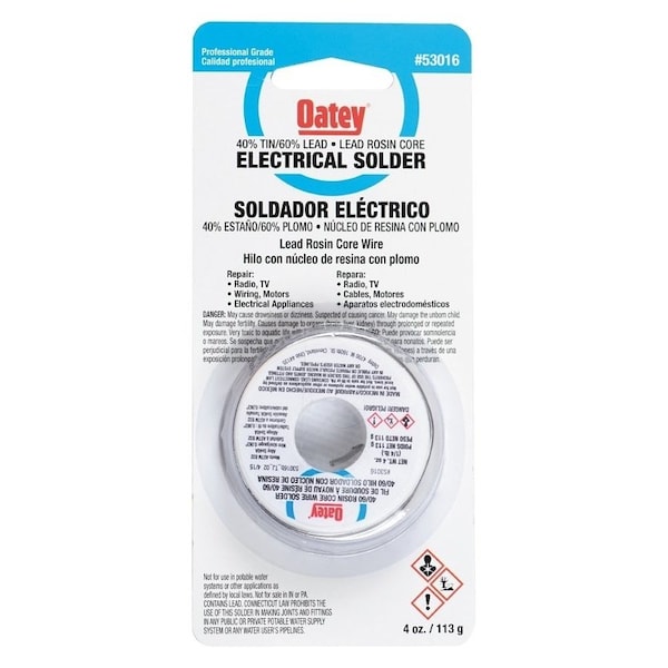Oatey rosin core wire solder is a tin-lead alloy wire solder with a rosin flux core for use in electrical applications, including wiring and other fine electronic work.