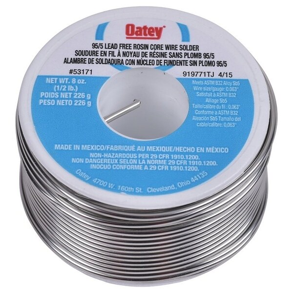 Oatey 95/5 lead-free rosin core wire solder is a tin antimony wire solder with a rosin flux core designed for use in electrical applications.