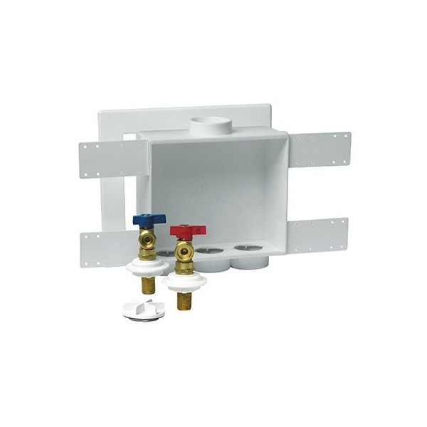 Oatey Quadtro, Washing Machine Outlet Box, 14 Turn Brass Ball Valves Copper Sweat, 2 Drain Opening Fits PVC Or ABS Schedule 40 DWV Pipe, Easy To Remove Knockout, Patent Pending Hammer Valves, Snap On Faceplate Frame Accommodates Up To 1 Drywall, Box Made Of High Impact Polystyrene, Top Or Bottom Valve Mount, 4 Support Brackets Included For Mounting, Box Dimensions 834W x 712H x 358D, Faceplate Dimensions 1134W x 1018H
