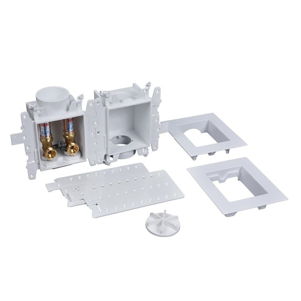 MODA Supply box system is designed to meet the needs of plumbing contractors for washing machine, ice maker, lavatory, toilet, dishwasher and SureVent air admittance valve applications. A universal single box platform provides maximum versatility, installation simplicity and rugged reliability. MODA Supply box system is the ultimate solution for speed and flexibility. Oatey MODA washing machine outlet boxes shall be used in residential or commercial applications requiring supply valves and a waste drain recessed in the wall. The MODA washing machine assembly contains a valve box and a drain box, connected by inter-locking wing flanges that can be easily disassembled and re-assembled. The inter-locking wing flanges shall allow installation on a single stud, between two studs or on separate walls, without the need for additional components. Valves shall be a two-piece design, permitting field replacement and shall be secured with a stainless steel retention clip. Valves are available with or without water hammer arrestors and shall be installed upright or inverted. The assembly shall include a removable quarter-turn plug for DWV testing and shall include an emergency drain port for added protection from hose leaks.