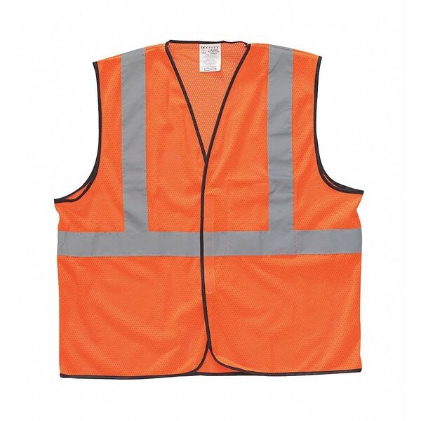 High Visibility Vest, ANSI Class 2, Vest Size 2XL/3XL, Traffic Safety Vest Color Orange/Red, Fits Chest Size 48 In. to 54 In., Gender Unisex, Stripe Color Silver, Vest Material Modacrylic, Vest Closure Type Hook-and-Loop, ATPV Rating Not Rated, Hazard Risk Category (HRC) 0, Vest Stripe Color Family Silver, Back Stripe Pattern U-Block, Vest Length 27 in, Number of Pockets (Inside) 1, Number of Pockets (Outside) 0, Number of Pockets with Closure 1, Features Mesh
