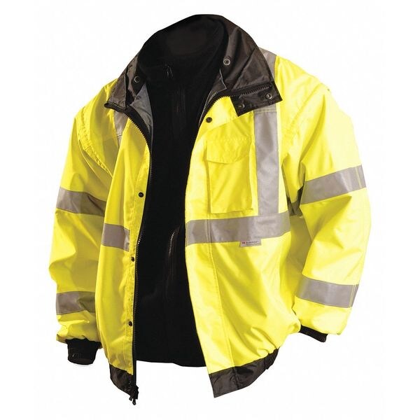 2" 3M Scotchlite Reflective Material; Can be Worn 4 Ways; Removable Outer Jacket Sleeves; Black Collar, Cuffs and Waistband; Rollup and Removable Hood; 2 Lower Front, 1 Front Flap, 1 Inner Pockets; Zipper and Snap Closure; Temperature Rated 46F to -2F