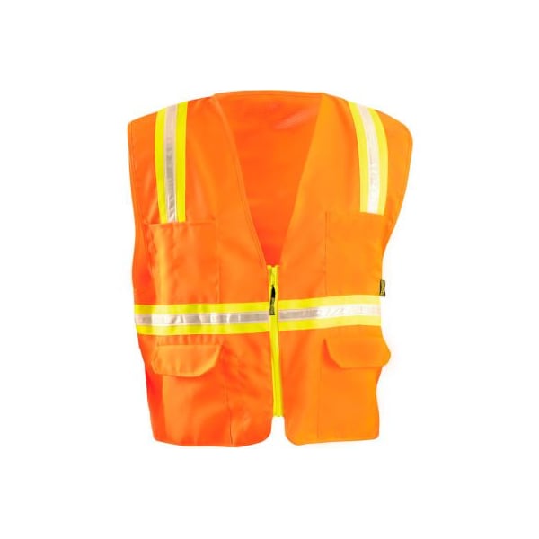 Classic mesh two-tone zip vest, hi-vis orange, s features: non-ansi 3/4" white gloss tape backed by orange or yellow trim, creating two-tone: one 360 horizontal stripe, two vertical stripes large arm opening for use over cold weather outer wear 100% polyester twill front, mesh back pockets: 2 inside lower, 2 outside lower flapped, 4 pen, 1 divided (outside upper chest) zipper closure