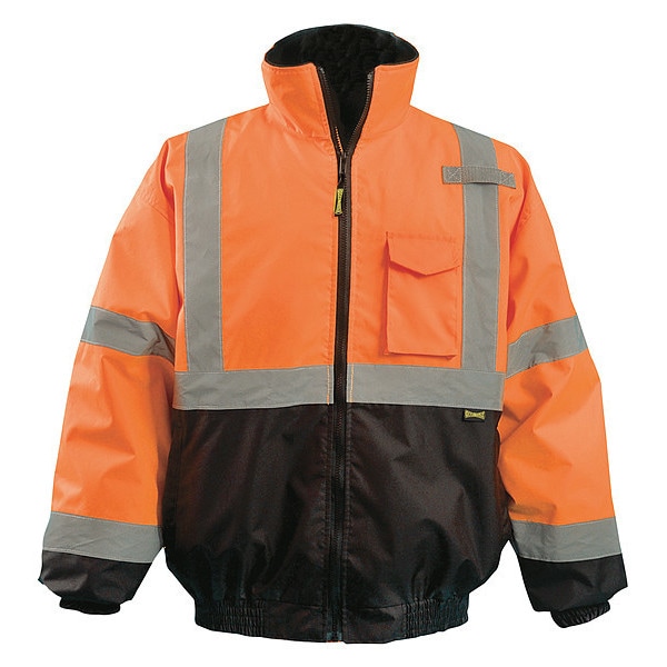 Jacket, Garment Type Jacket, Length Type Waist, Style Bomber Jacket, Back Stripe Pattern U, ANSI Class 3, ANSI Type R, Gender Unisex, Front Closure Type Zipper with Storm Flap, Color Orange, Size M, Number of Outside Pockets 3, Includes Hood Yes, Hood Style Packable Hood in Collar, Maximum Chest Size 40 in, Material Polyester, Temperature Rating -5 Degrees to - 45 Degrees F, Includes Removable Liner Yes, Reflective Stripe Border Type None, Garment Features Black Bottom